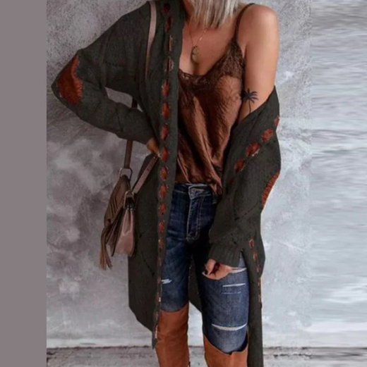 Le cardigan en tricot bohème chic apporte un style sans effort à votre garde-robe avec son design en tricot texturé et confortable et ses détails découpés saisissants. Sa silhouette longue et sa coupe décontractée en font la pièce de superposition parfaite pour les journées plus fraîches, tandis que les patchs audacieux aux coudes ajoutent une touche de charme rustique.