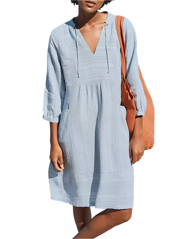 La mini-robe Charena allie aisance et élégance grâce à sa silhouette fluide et à son tissu doux. Dotée d'un décolleté en V flatteur et de manches 3/4 décontractées, elle est idéale pour les journées ensoleillées et les sorties décontractées.