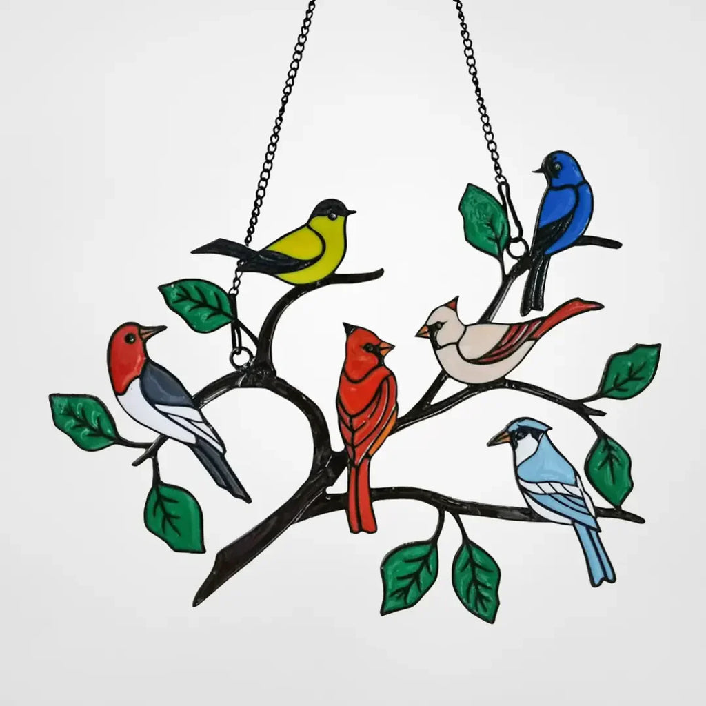 Cette Décoration de Fenêtre avec Oiseaux Teints est si vibrante et accrocheuse. Un colibri, un oiseau rouge, un oiseau bleu, et un turquoise à feuilles de l'Est sont des oiseaux extrêmement beaux et mignons.