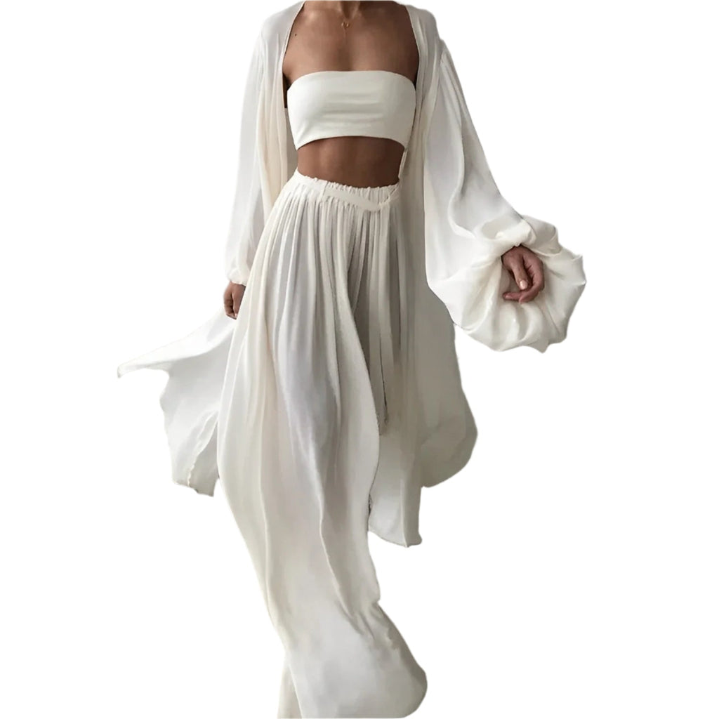 - Ensemble coordonné en 3 pièces : Comprend un pantalon, un top tube et un cover-up froncé pour un look complet.