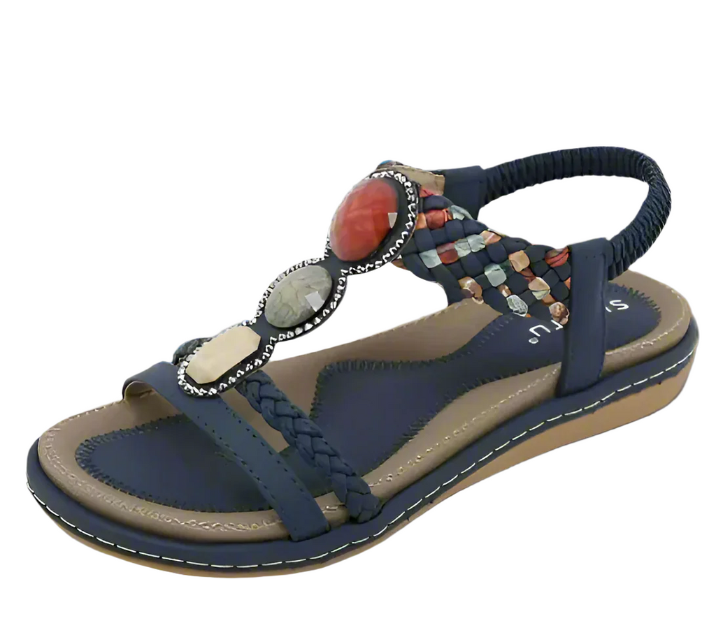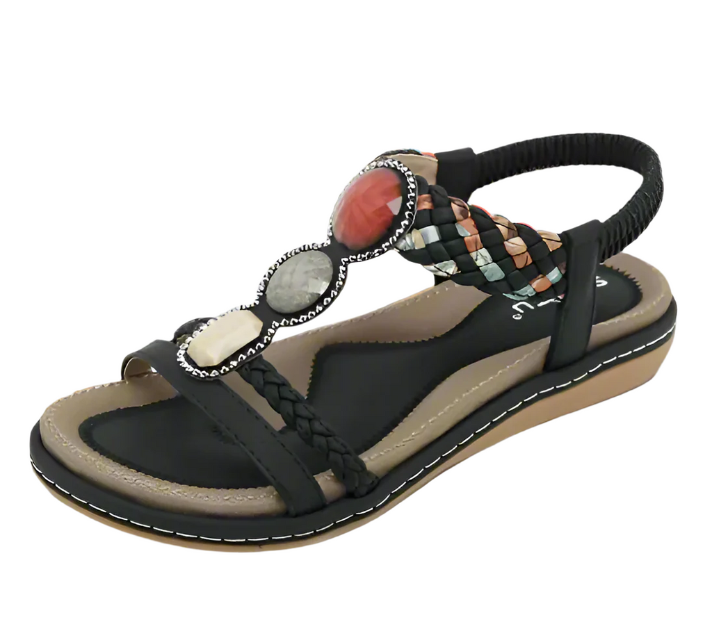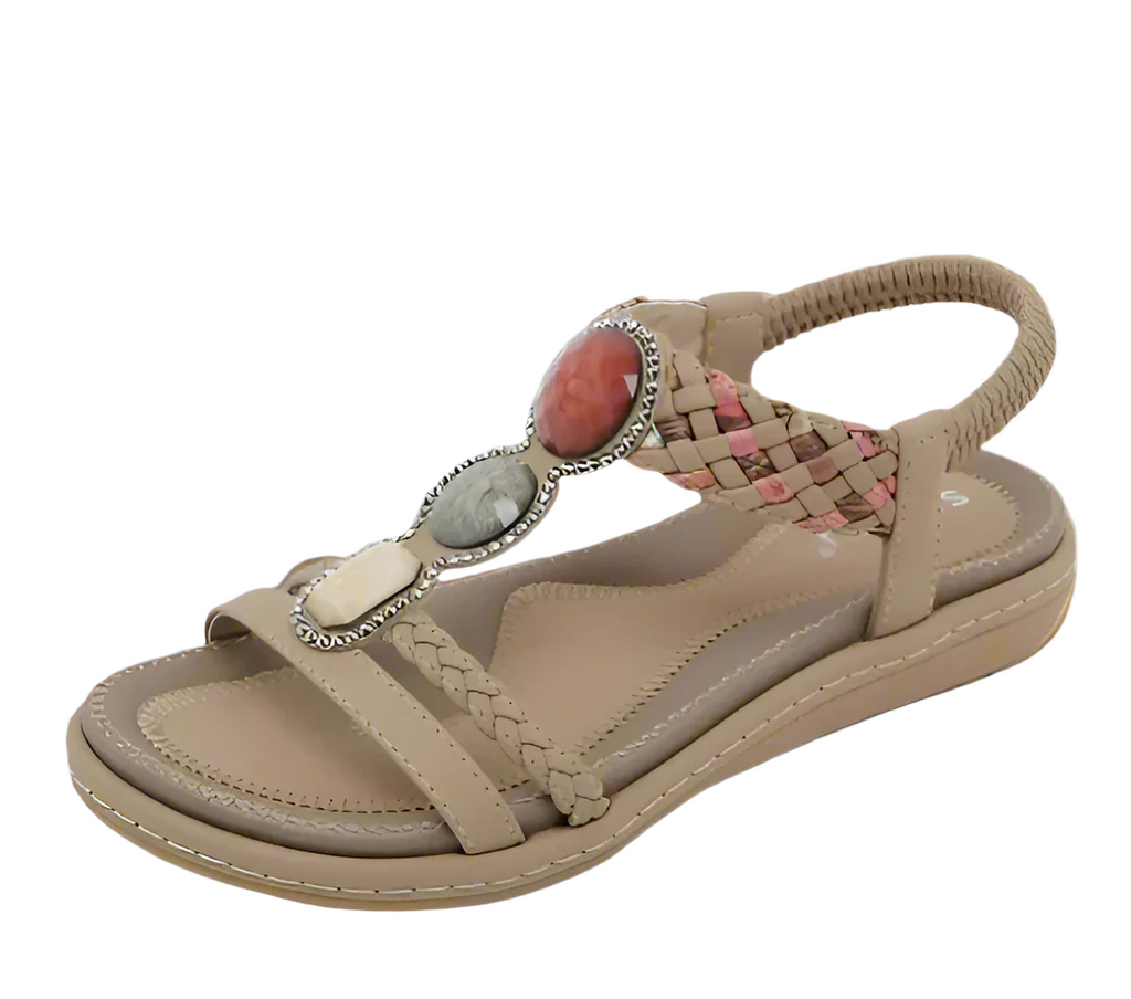 Les sandales DivinaCharm apportent une touche élégante à votre garde-robe estivale. Dotées d'une élégante bride tressée ornée de pierres décoratives, ces chaussures plates se démarquent tout en alliant confort et élégance. Parfaites pour les journées décontractées ou les soirées d'été plus habillées.