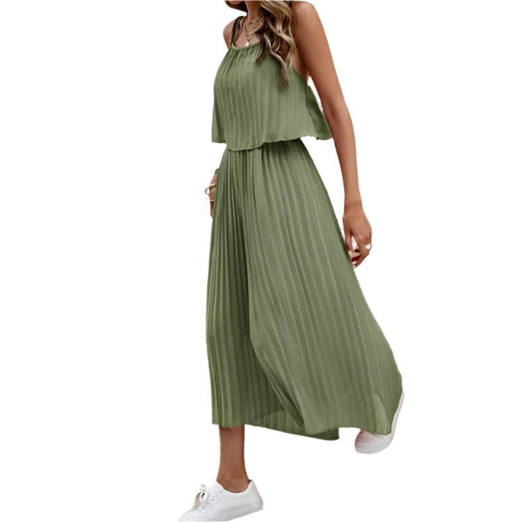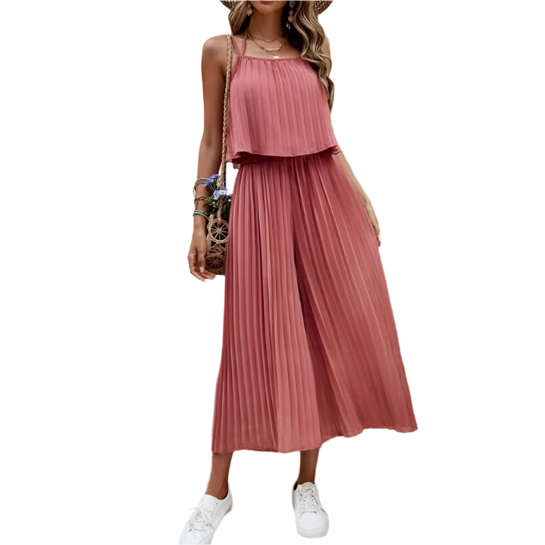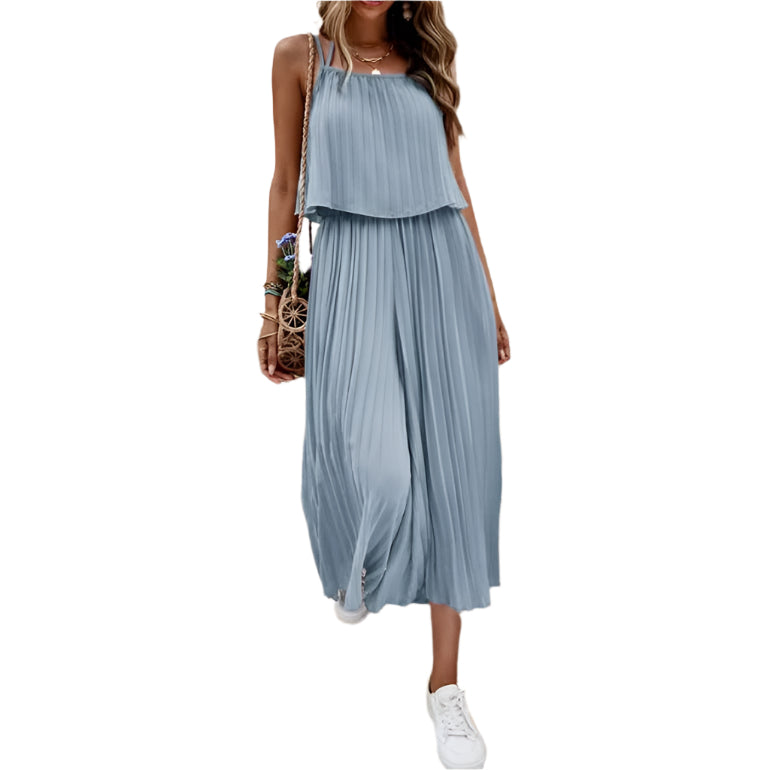 Entrez dans la saison estivale avec cet élégant et aéré ensemble en deux pièces, composé d'un top délicat à bretelles spaghetti et d'une jupe maxi plissée flottante. Conçu pour offrir à la fois élégance et confort, cet ensemble est parfait pour les vacances, les sorties décontractées ou les journées ensoleillées. Sa silhouette minimaliste et sa sensation légère en font un excellent choix pour rester au frais et stylé sous le soleil.