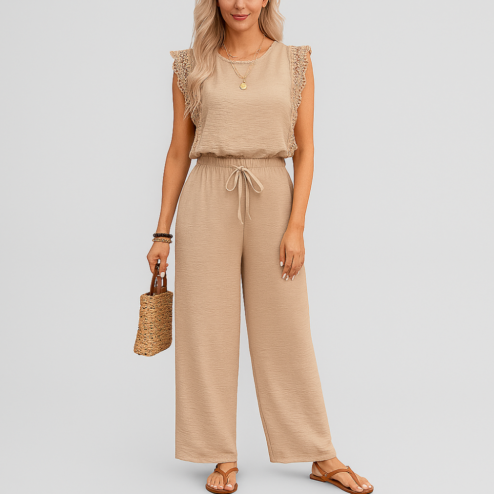 Cette combinaison sophistiquée apporte une touche élégante à votre look avec son détail en dentelle contrastante et son col rond classique. Idéale pour toutes les occasions, cette tenue offre l'équilibre parfait entre confort et allure chic.