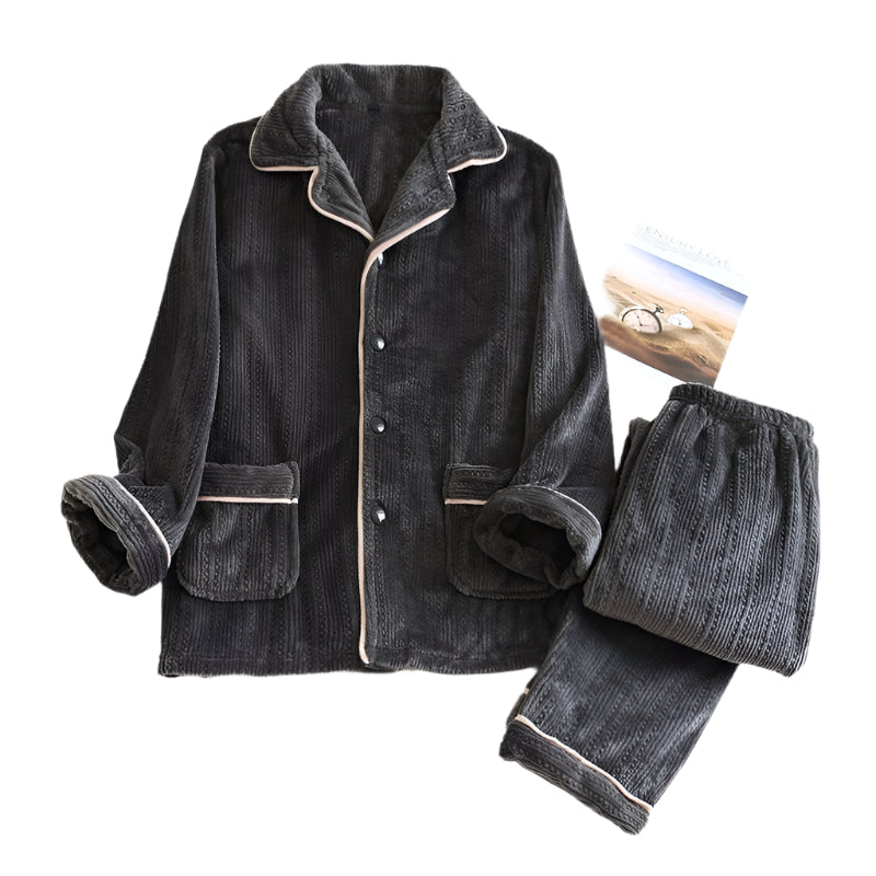 Conçu avec à la fois style et confort à l'esprit, cet ensemble de pyjama présente une texture en velours classique qui ajoute une touche d'élégance à votre collection de vêtements de nuit. L'ensemble est parfait pour les nuits plus fraîches et offre un équilibre de chaleur idéal sans se sentir encombrant.