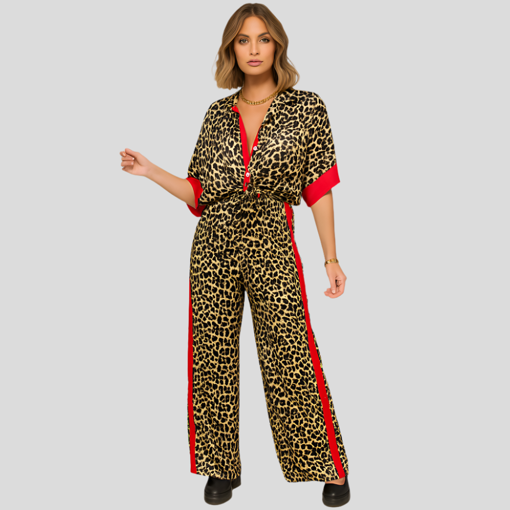 Affirmez votre style avec l’ensemble deux pièces Klara Luxe à imprimé léopard, conçu pour les femmes qui apprécient à la fois l’élégance et le confort. Cet ensemble arbore un imprimé léopard saisissant qui respire la confiance et la sophistication, parfait pour passer sans effort des journées actives aux soirées animées.