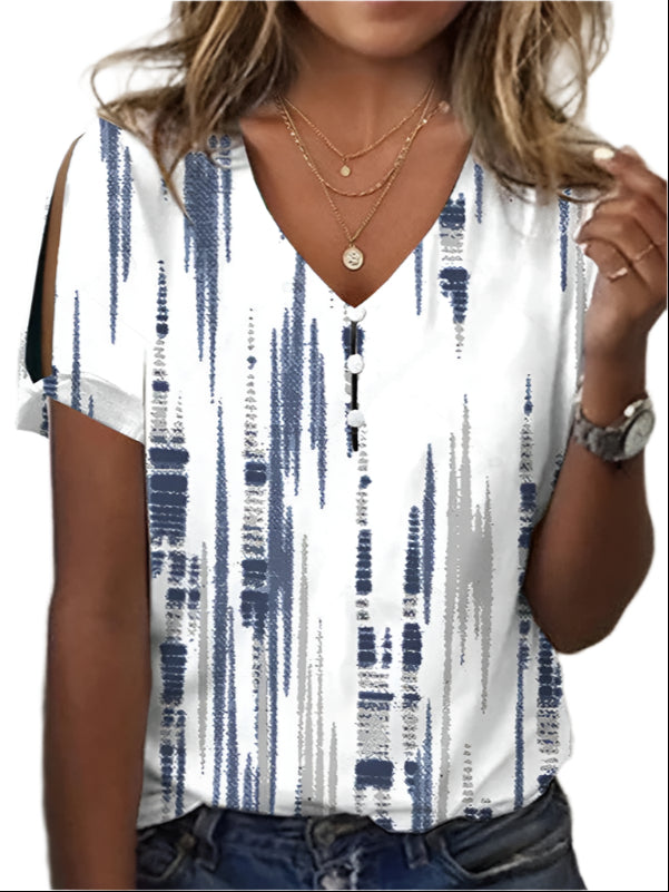 Le haut Luiza se distingue par ses rayures verticales frappantes en bleu marine et gris sur un fond blanc éclatant. Avec son décolleté en V flatteur, sa fermeture à boutons fonctionnelle et ses découpes tendances au niveau des épaules, ce top allie flair artistique et praticité décontractée.