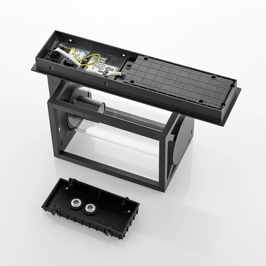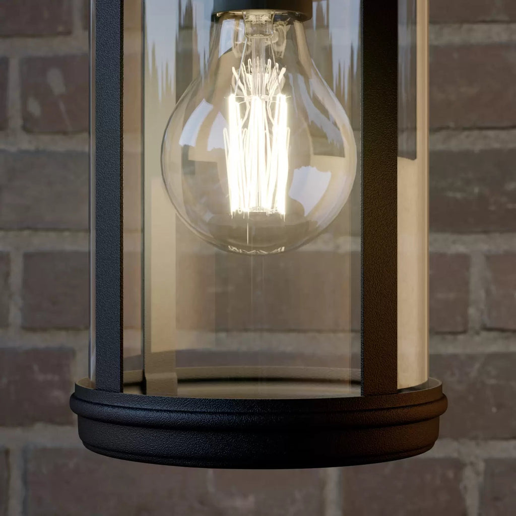 La lampe murale extérieure LumiGlow présente un cadre en métal noir saisissant avec un encasement en verre clair, mettant en valeur la beauté d'une ampoule à filament nu. Son design minimaliste, mais néanmoins industriel, s'intègre parfaitement dans des environnements modernes, contemporains et rustiques.