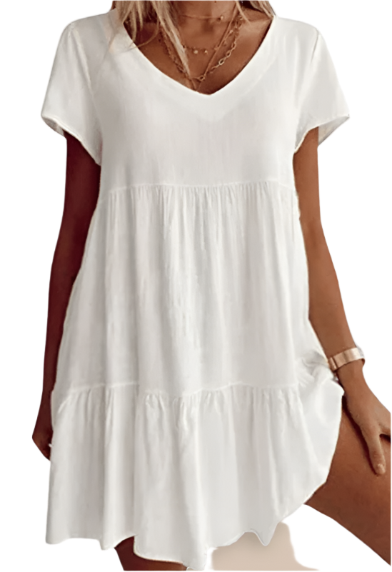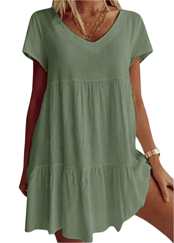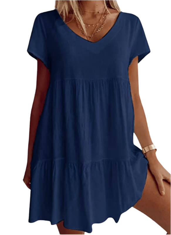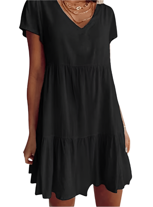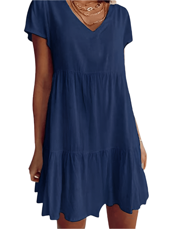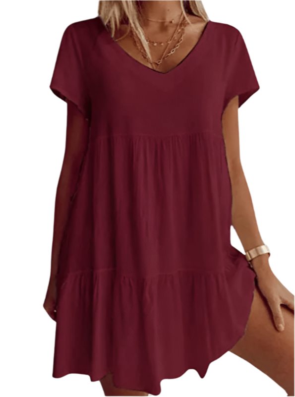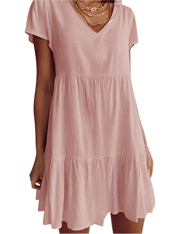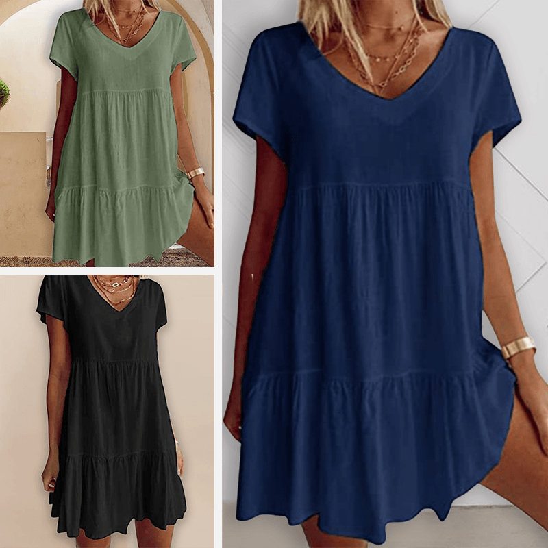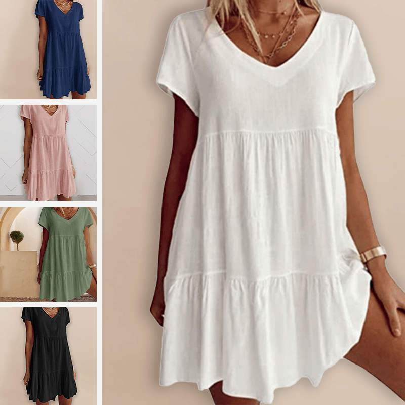 Minnie - Robe décontractée à manches courtes et décolleté en V ajoute une touche élégante à votre garde-robe avec sa coupe décontractée et son design charmant en V. Idéale pour des sorties décontractées ou à porter stylée lors d'événements spéciaux, cette robe offre confort et style sans effort.