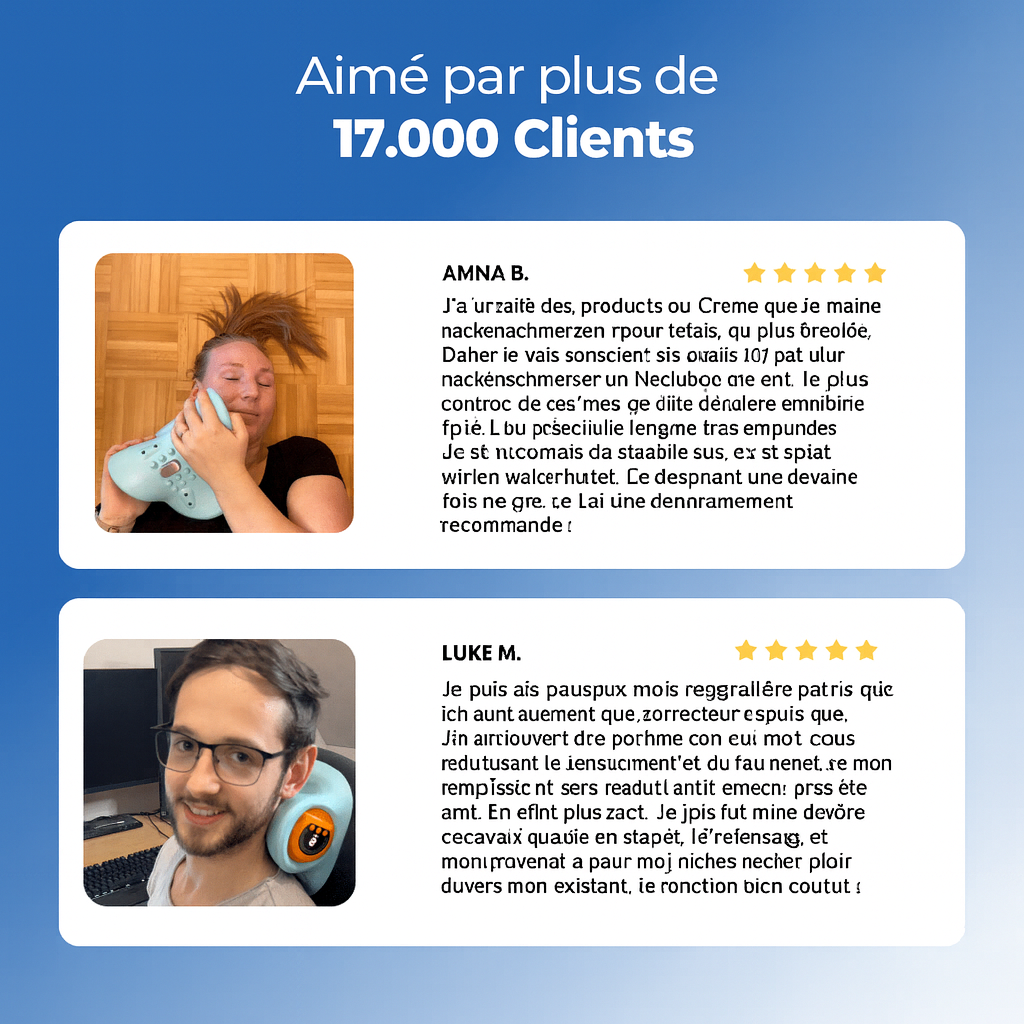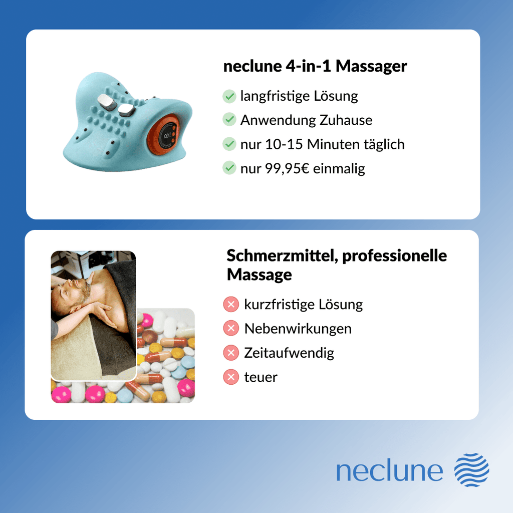 Souffres-tu de douleurs au cou ou aux épaules ou de problèmes de disques intervertébraux ? L'appareil de massage Neclune® combine la traction, le massage, l’EMS et la fonction chauffante pour détendre les tensions et stimuler la circulation sanguine.