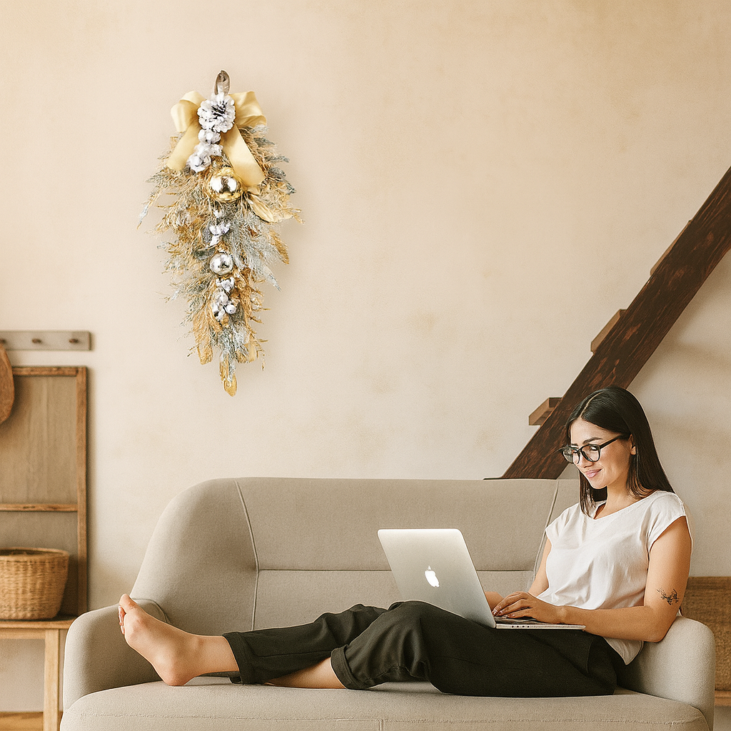 Accueillez la magie des fêtes dans votre foyer avec le Noellea | Goutte décorative festive. Cette décoration de Noël transforme instantanément votre porte d’entrée ou votre mur en un point fort chaleureux et accueillant. Grâce à ses textures raffinées et ses détails scintillants, elle capture l’essence même de Noël et crée une atmosphère festive pour vous et vos invités.
