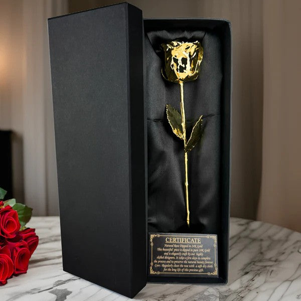 Cette exquise rose à tige longue est faite d'or véritable et est un symbole intemporel d'amour et d'appréciation. Chaque pétale est soigneusement détaillé, capturant la beauté d'une vraie rose, tout en durabilisant toute une vie. Présentée dans une élégante boîte noire, elle constitue un cadeau fantastique pour toute occasion spéciale.