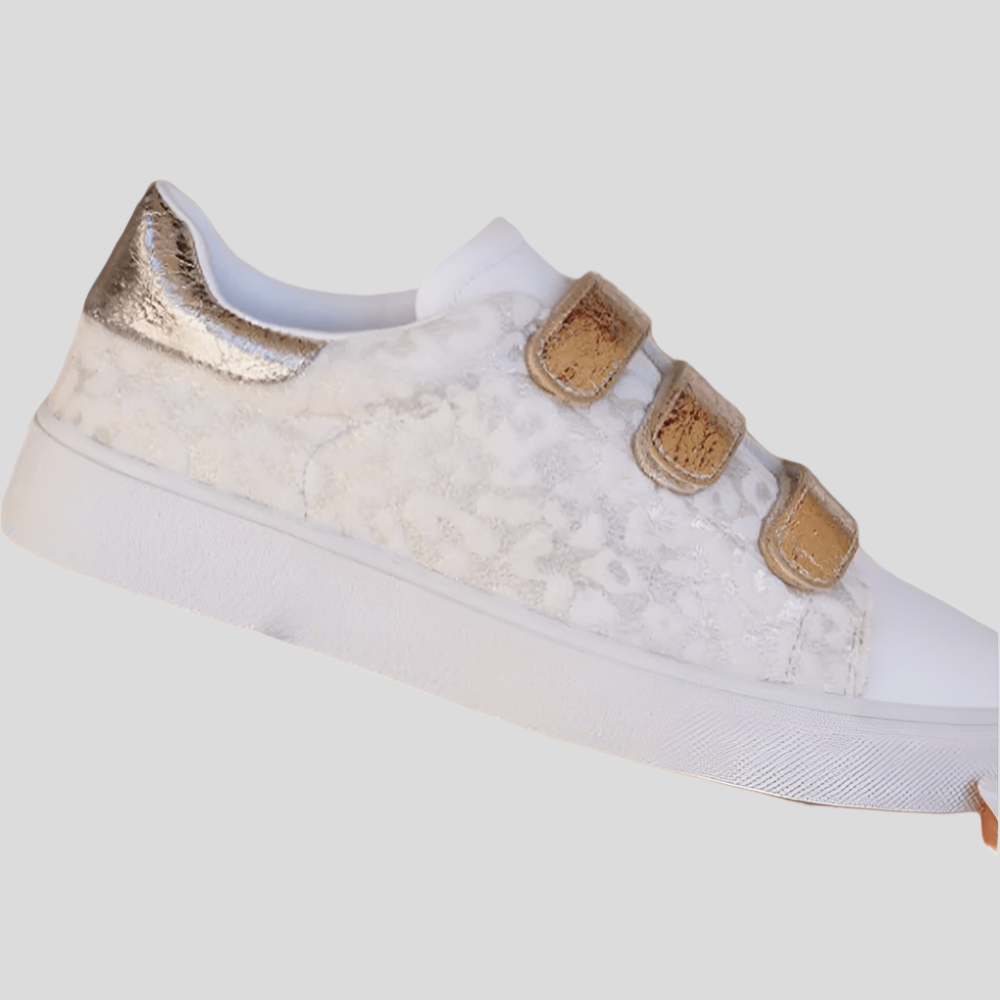 Les baskets Valerina apportent une touche de style décontractée à votre look quotidien grâce à leur base blanche élégante et leurs subtils détails léopard. Les trois brides dorées ajoutent une touche luxueuse et moderne. Parfaites pour une tenue décontractée élégante sans sacrifier le confort.